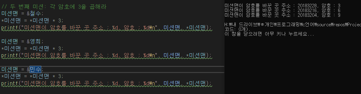 printf("미션맨이 방문하는 곳 주소 : %d, 암호 : %d\n", 미션맨, *미션맨);