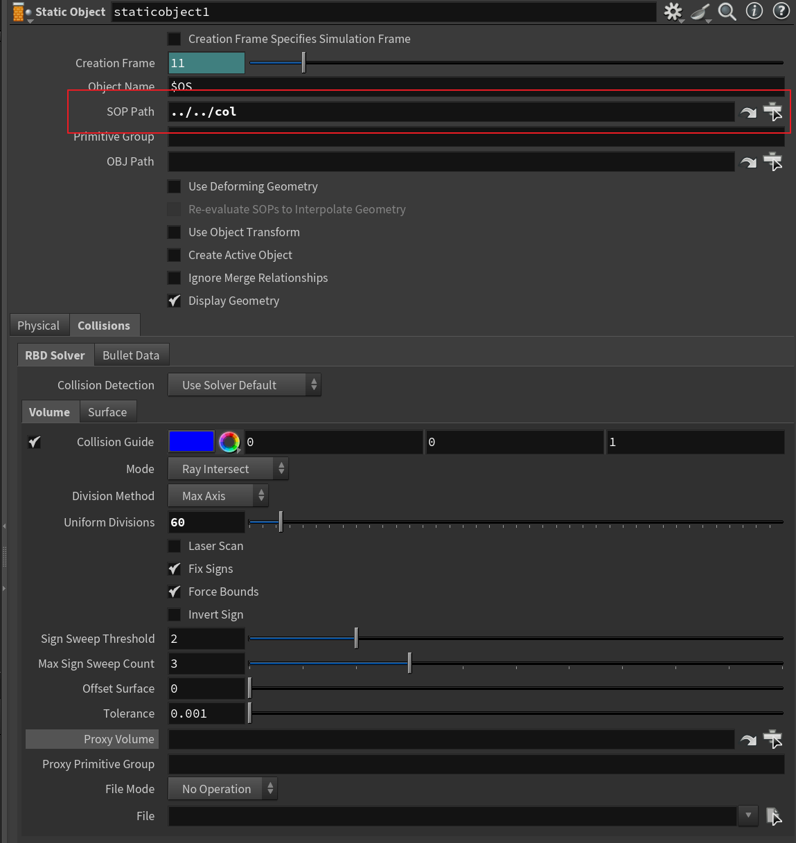 staticobject의 SOP Path에 충돌 조건으로 사용할 source Geo의 경로를 입력한다.
