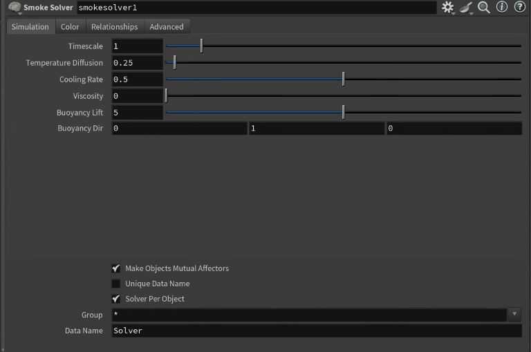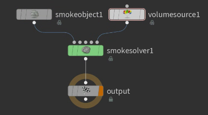 - smokesolver: 주입된 볼륨의 속성 변화를 계산하여 시뮬레이션 진행(pyrosolver를 사용하면 속성값을 더 쉽게 조정할 수 있다. 실제로 작업할 때는 pyrosolver를 사용하게 된다.)