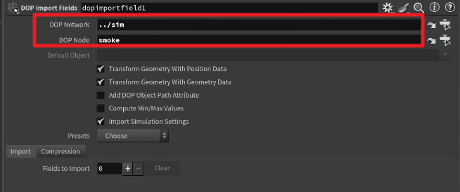 Dop Network에는 특정 dopnet 경로를 입력하고, Objects에는 위에서 지정한 smokeobject의 object name을 입력해준다.