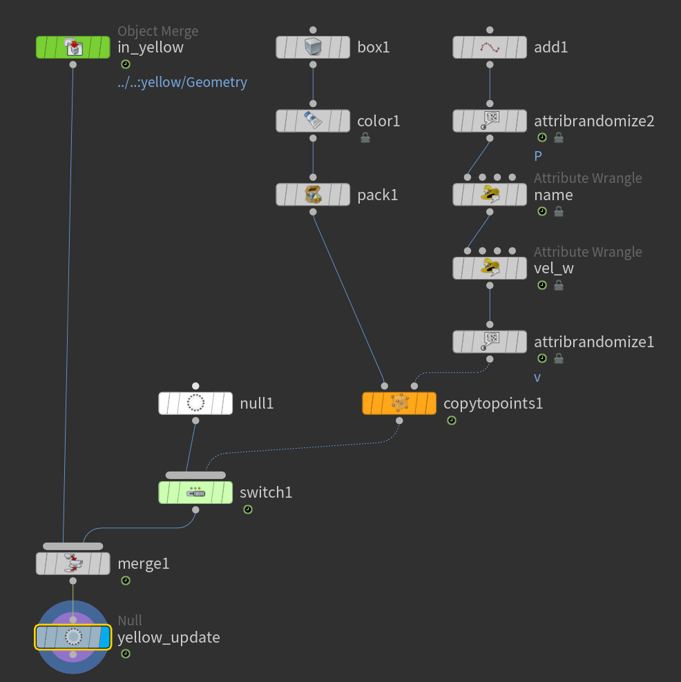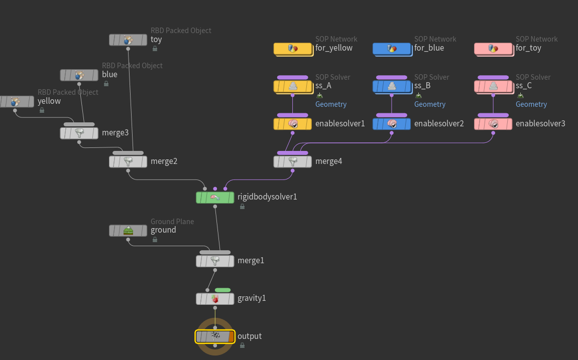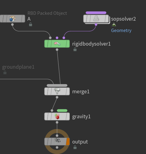sopnet 안에서는 object merge를 통해 특정 RBD Packed Object의 이전 프레임 geometry를 불러온 다음, sop solver와 동일한 방식으로 주입할(생성할) source를 merge 하여 내보낸다.