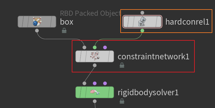 Contraint network 노드의 첫 번째 input에는 rbd packed object를, 두 번째 input에는 relationship 노드를 연결해 준다.